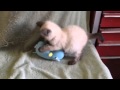 Hippo was named after the little blue hippo you see in the pictures and video. As you will see the kittens look very much alike (except the runt who is black and white, and not a siamese marking). So we used the blue hippo in the pictures with the males and the pink mouse in the female pictures so we would know who was who when we download the pictures!!! This little guy just went after the blue hippo in the photo shoot so we are naming him Hippo!